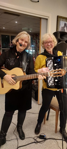 Flott sang og musikk med Anne og Åse, gamle og nye sanger.🎶 De dro i gang allsang, og vi bidro så godt vi kunne.😊